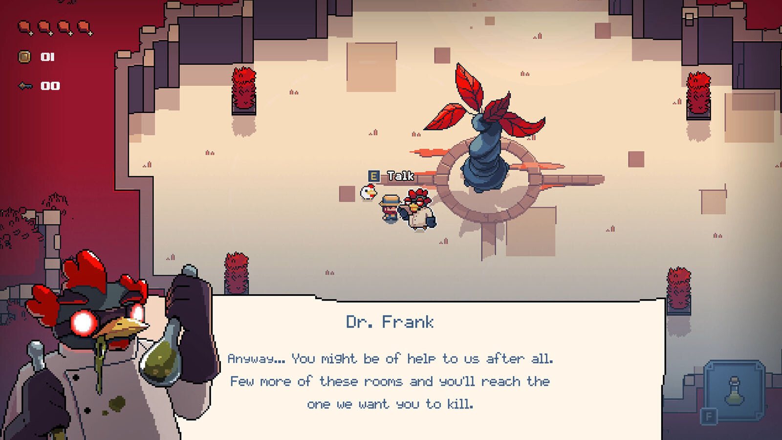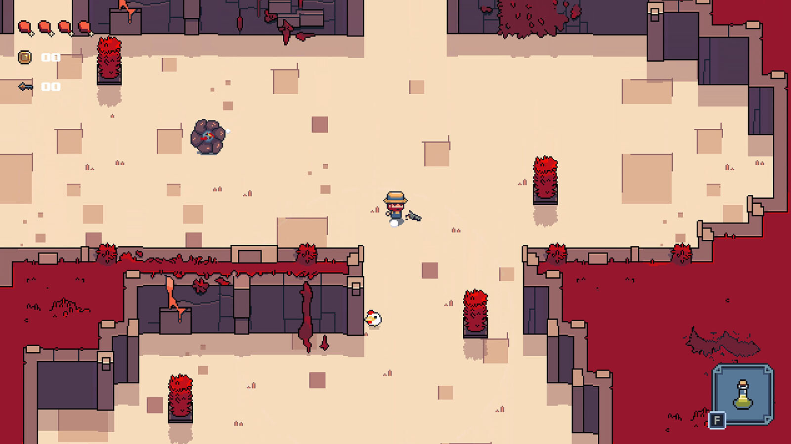 Du wirst es mit vielerlei Geflügelmonstern als Gegnern und Bossen zu tun bekommen, sodass jede Begegnung einzigartig ist. Die Räume, die erscheinenden Gegner, die Mutationen, die Upgrades und die zurückbleibende Beute sind zufallsbasiert, sodass jeder Durchlauf etwas Neues bietet und zum Experimentieren einlädt.