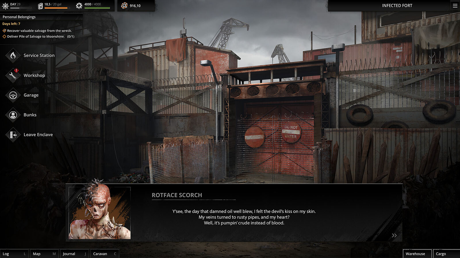 Es ist nicht alles nach Plan gelaufen. Früher oder später könnte dir die Kontrolle über die Raffinerie aus den Händen gleiten. Und, tja … dazu kam es auch. Der tödliche Angriff der Sawblades hat dir alles genommen. Dein Freund, Victor, ist weg. Dein Treibstoff alle. Die Ausrüstung weg. Crewmitglieder verschwunden. Zeit, das erste Fahrzeug aus Schrott zusammenzubauen, eine neue Crew zusammenzutrommeln und wieder auf Kurs zu kommen. Wir dürfen keine Zeit verlieren, denn Der Große Sturm ist nahe.