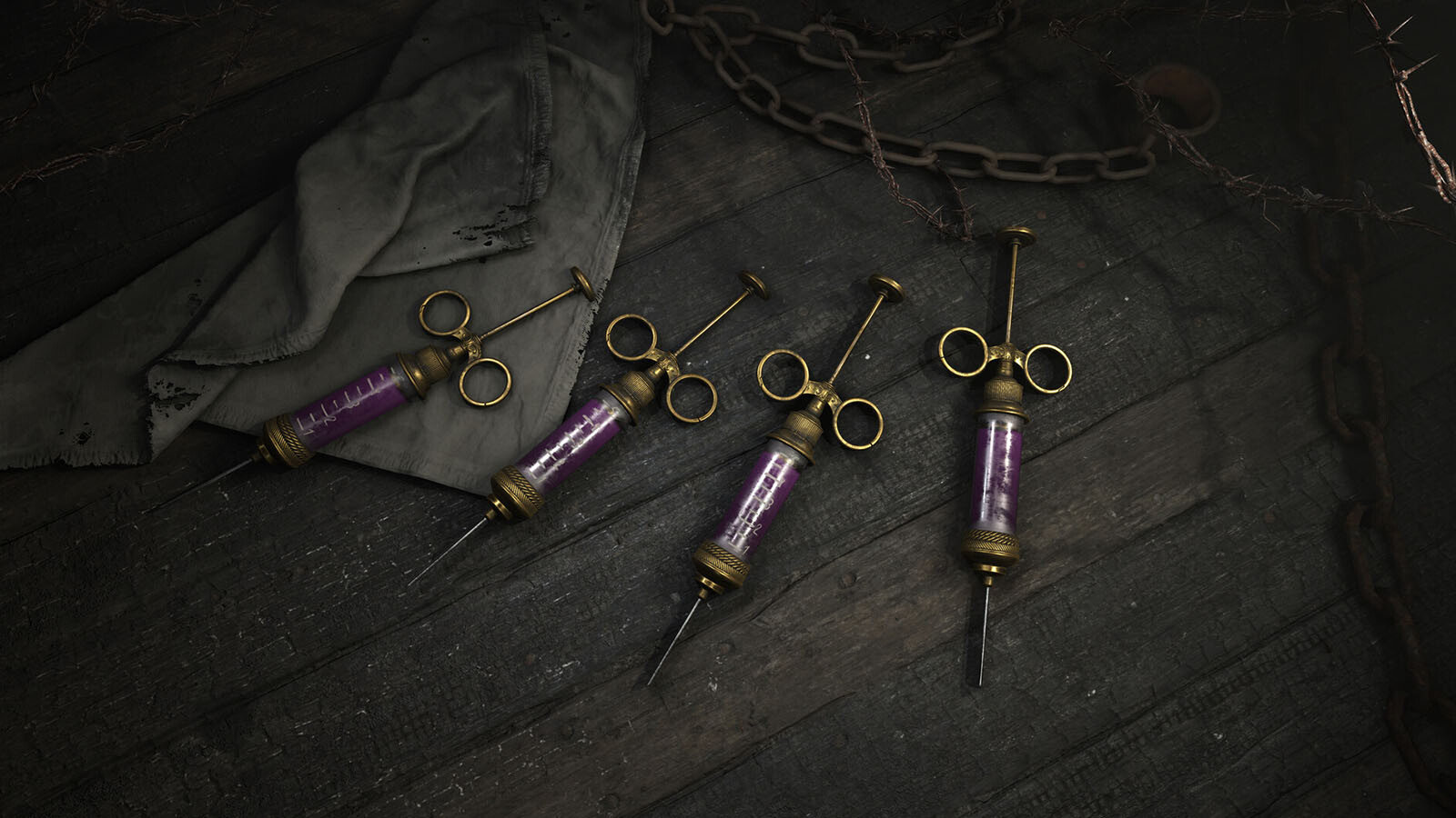 Damien Yedaiah kannte nur einen Weg, um Frieden zu erlangen: Schmerz. Aber sein Bedürfnis war zu viel für seinen Körper, also braute er sich diese Regenerationsspritze zusammen, um seinen Körper intakt zu halten, damit sein Geist die süße Flucht der Selbstgeißelung genießen konnte.
