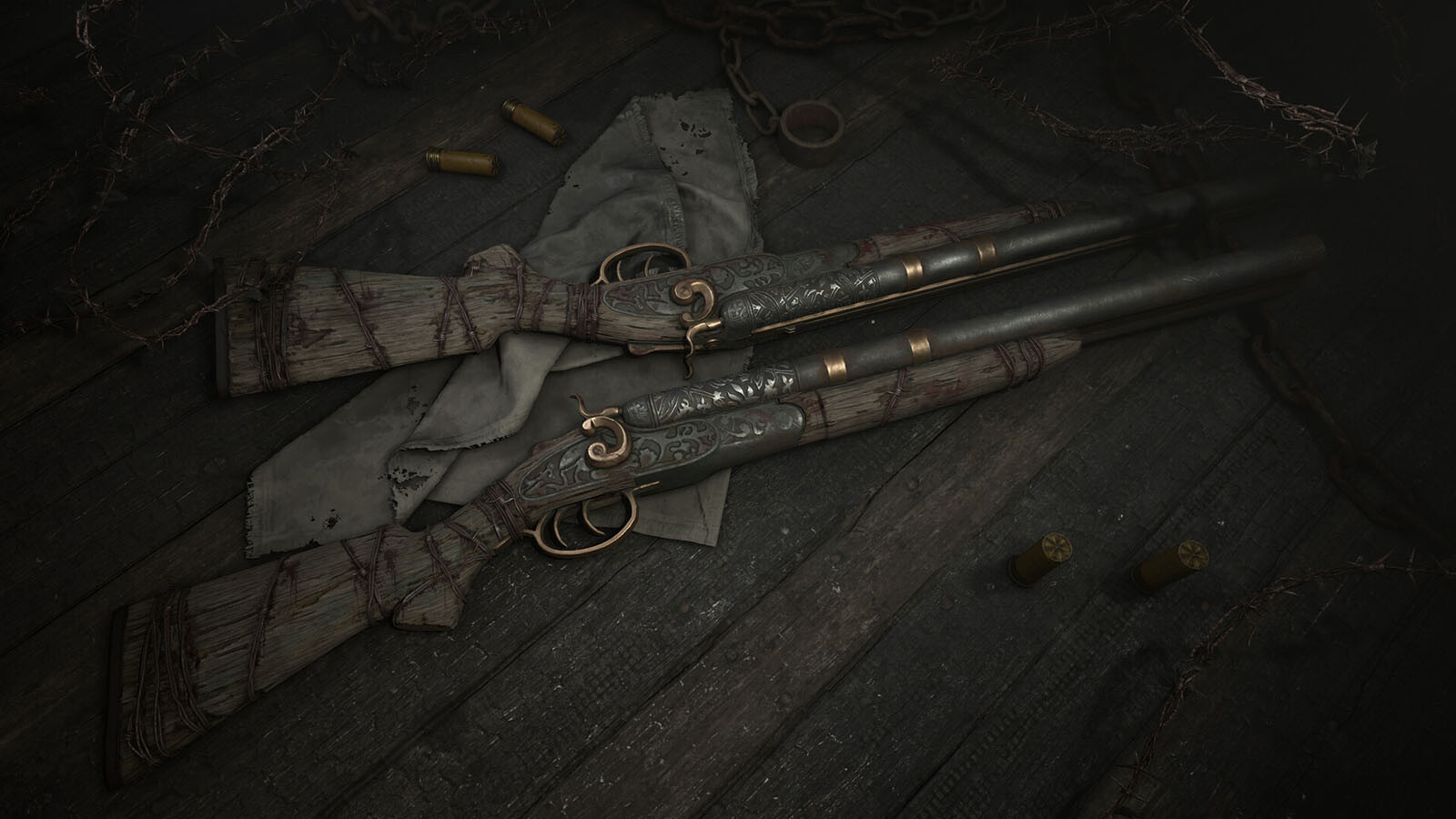 Als sein Körper sich den Schmerzen widersetzte, griff Damien Yedaiah zu einer unkonventionellen Methode, um seine Dämonen in Schach zu halten. Er schmückte den Griff dieses Nagant M1895 Offizier Rabauke mit Stacheldrähten, damit er den gleichen Schmerz genießen konnte, den er damit seinen Opfern zufügte.
