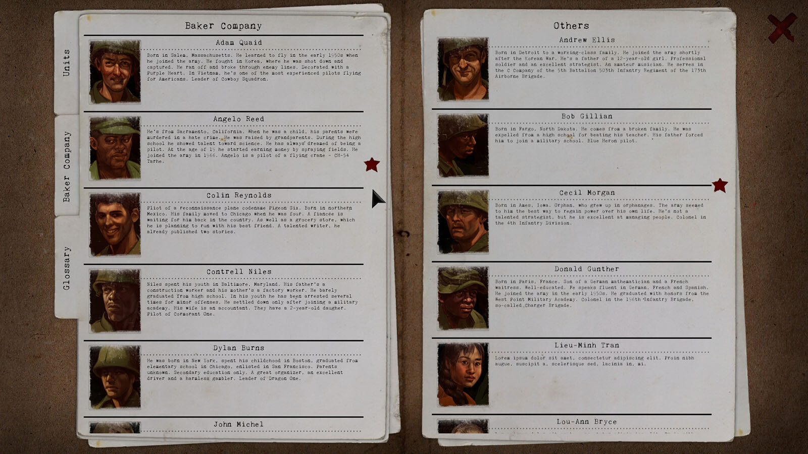 Aber das ist noch nicht alles! Die Squad Management-DLC vertieft auch die Hauptstory. Schaue dir das schön gestaltete Glossar an. Darin findest du Porträts aller Haupthelden und erfährst mehr über ihre Hintergründe. Eine weitere Neuerung ist ein hochfunktionales Logbuch, das alle Dialoge, Entscheidungen und Ereignisse aufzeichnet, wodurch es viel einfacher wird, der Geschichte zu folgen.