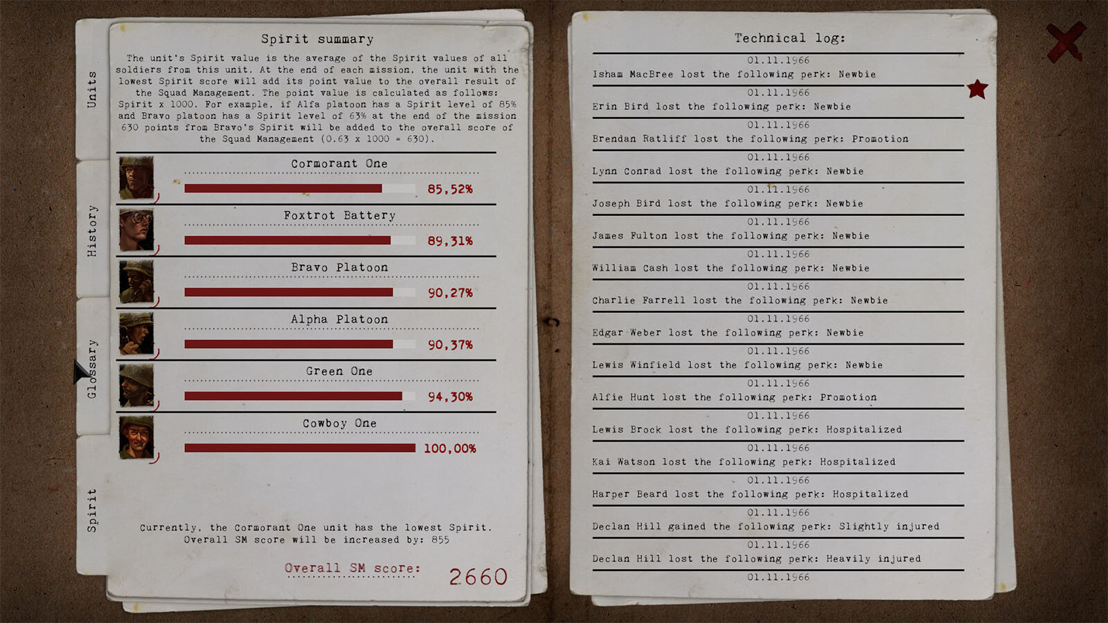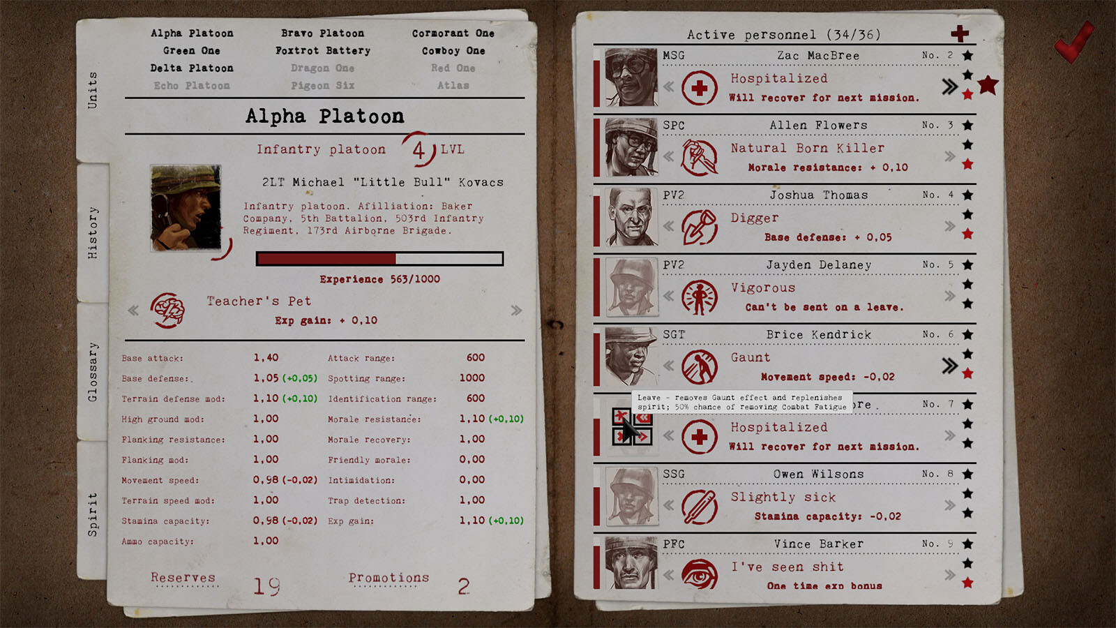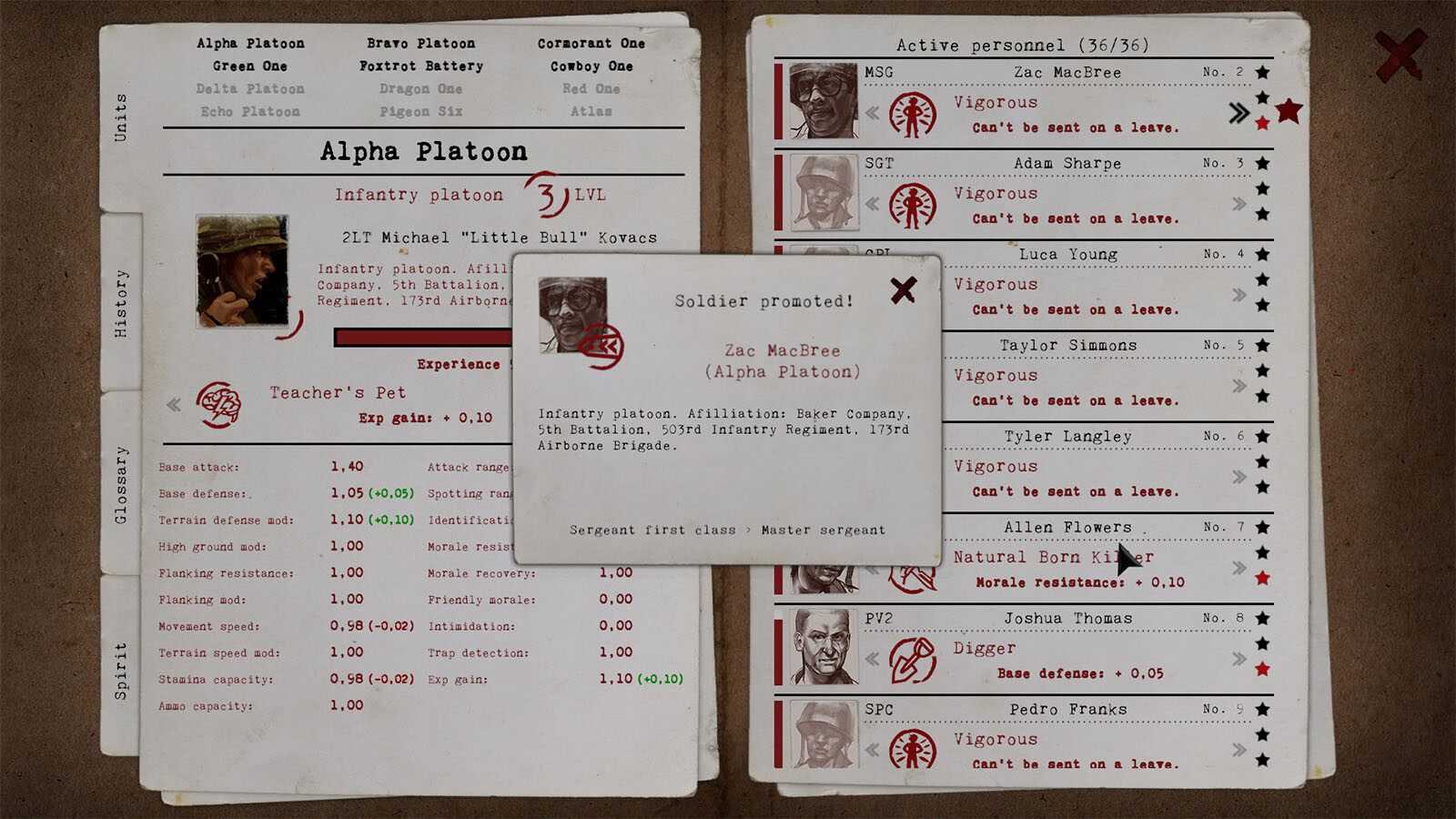 Erhalte Einblick in den Trupp jeder Einheit und stärke die Beziehung zu deinen Untergebenen. Lerne ihre Namen kennen. Merke dir die Gesichter herausragender Soldaten. Beobachte, wie sie ihre Fähigkeiten verbessern (Über 60 einzigartige Perks! Einige davon wirken sich auf eine ganze Einheit aus) und sich auf dem Schlachtfeld besser schlagen. Ordne sie verschiedenen Zügen zu. Achte auf ihre Gesundheit, indem du sie in den Urlaub schickst. Rekrutiere neue Soldaten und weise diejenigen, die kampfunfähig sind, aus dem Dienst aus. Je mehr Erfahrung deine Truppen sammeln, desto besser werden sie sich auf dem Schlachtfeld verhalten. Für die Zwecke der DLC haben wir ein umfassendes Moralsystem entworfen – für jeden einzelnen Soldaten und die gesamte Baker-Kompanie.