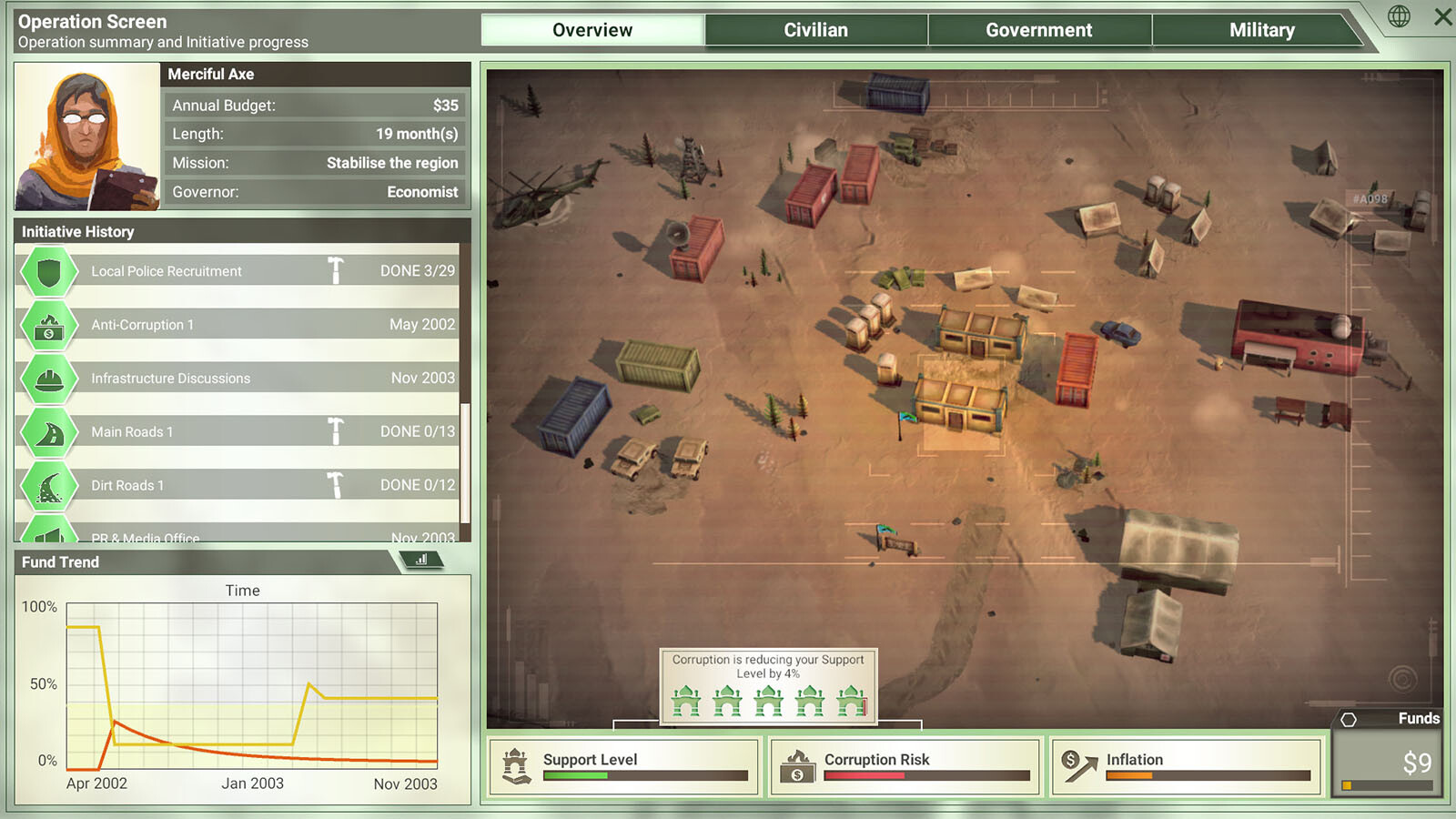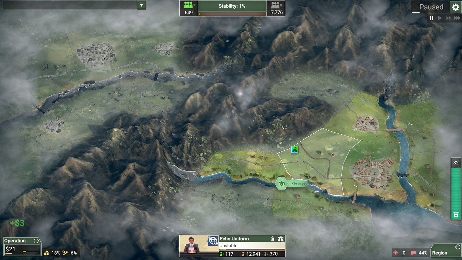 In Rebel Inc.: Escalation ist der Krieg „vorbei“ – aber wir wissen alle, dass das nicht viel heißen will. Um ein vom Krieg zerrissenes Land zu stabilisieren, musst du zivile und militärische Prioritäten gegeneinander abwägen, um Herz und Verstand der Bevölkerung für dich zu gewinnen und gleichzeitig einen tödlichen Aufstand daran zu hindern, die Macht zu ergreifen!