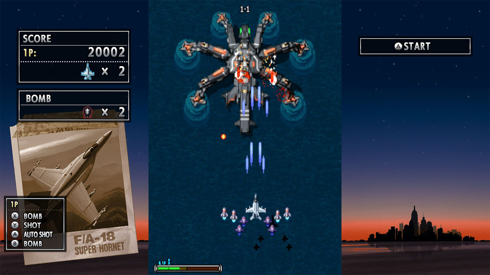 - Das Abfeuern von Schüssen auf feindliche Flugzeuge lädt Energie in die Level-Anzeige am unteren Bildschirmrand.